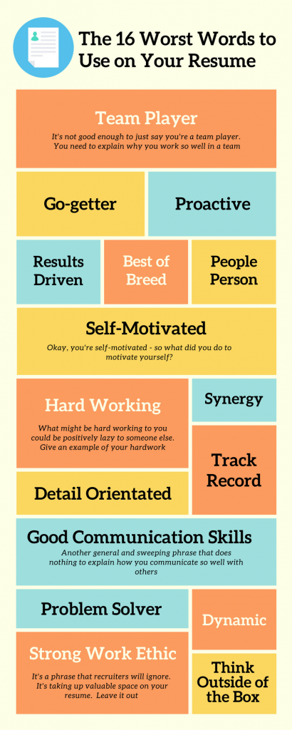 These are the kind of words that add little to your resume. At best, you are taking up valuable room on your resume. At worst, you will come across as trying too hard and make the recruiter cringe with embarrassment.